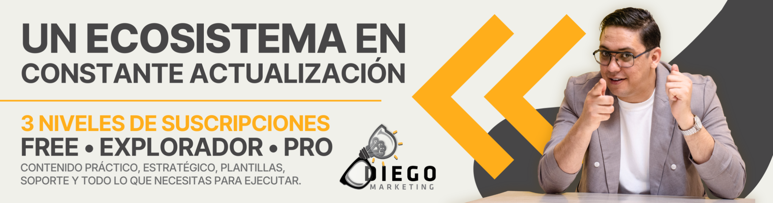 Tu inversión en crecimiento comienza aquí con acceso total al ecosistema de diegomarketing.co: Cursos y Talleres: Lecciones en video y certificaciones. Infoproductos Pro: Templates de pauta y planeación profesional. Soporte Prioritario: Consultas directas para tus campañas.